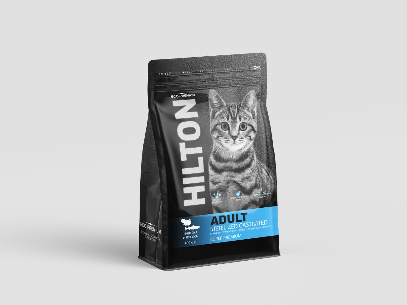 СУХОЙ ПОЛНОРАЦИОННЫЙ КОРМ HILTON ДЛЯ СТЕРИЛИЗОВАННЫХ КОШЕК И КАСТРИРОВАННЫХ КОТОВ С ИНДЕЙКОЙ И ЛОСОСЕМ